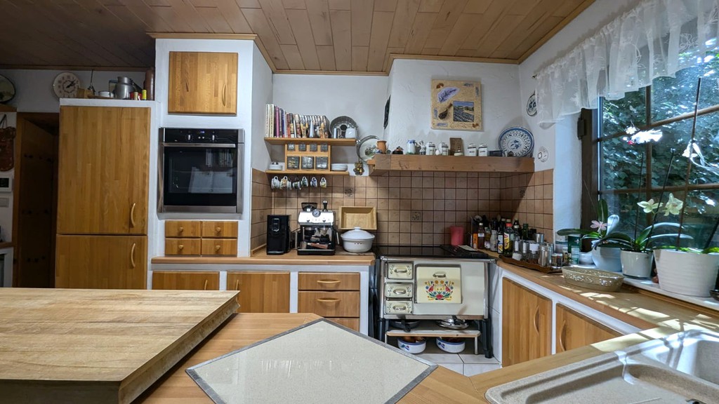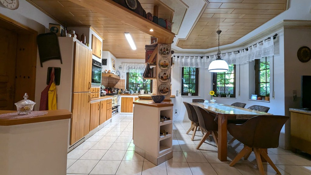 Weiter über die Wohnungsabschlusstür im EG gelangen Sie in den offenen Wohnbereich, der aus der liebevoll gemauerten Küche, dem Essbereich im Erker, sowie das Wohnzimmer besteht. Von hieraus haben Sie Zugang zur Terrasse und den schönen Garten, vom Wohnbereich aus gelangen Sie in das