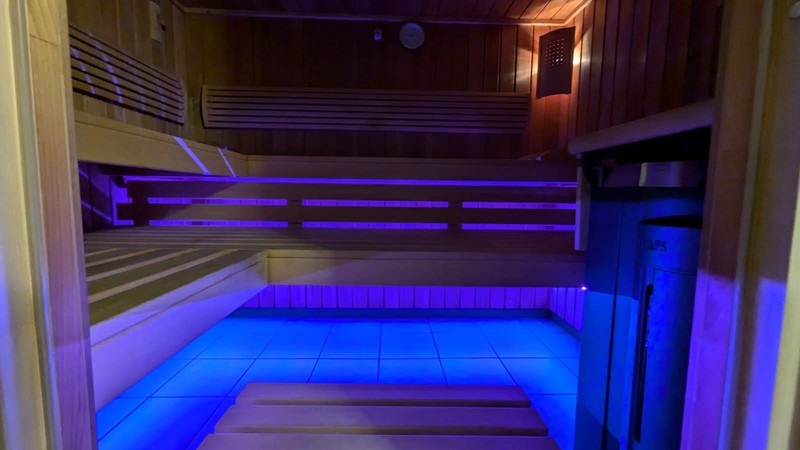 Weiter gelangen Sie in den Wellnessbereich, welcher neben der modernen Klafs Sauna über einen Ruhebereich und den Duschraum mit angrenzender Garderobe verfügt.