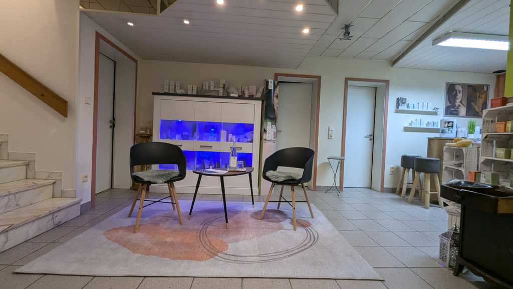 Vom Eingangsbereich der Immobilie kommend gelangen Sie ohne die Wohnung des Erdgeschosses betreten zu müssen, in den separaten Abgang zum Untergeschoss. Sie gelangen in einen großen Eingangsbereich, von dem aus Sie Zugang in alle Zimmer haben und der derzeit als Anmeldung bzw. Wartebereich für die Wellnessoase / Kosmetikstudio genutzt wird, hier befindet sich ein großes Fenster.